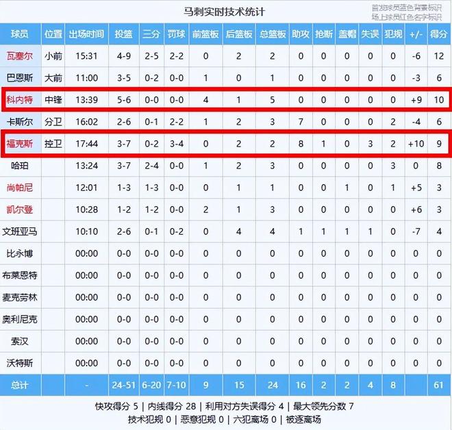 瓦塞尔12分2板、科内特10分5板、福克斯9分2板8助、哈珀8分3板、卡斯尔6分3板7助、巴恩斯6分1板、文班亚马4分4板1助、凯尔登3分3板、尚帕尼3分1板