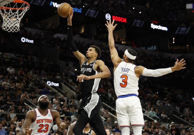 来到防守端罗宾被文班造成犯规,两罚全丢今天双方这罚球命中率都很差,布伦森单挑文班上篮不中,瓦塞尔空切暴扣,文班亚马抢断哈特,卡斯尔快下也扣一球,50-43马刺领先到了7分尼克斯喊出暂停。这比赛真好看裁判不抢戏,判罚尺度给得很大,让球员自己决定比赛,不轻易响哨,这才是球迷想要看到的比赛,常规赛要是这样吹NBA将吸引更多关注!回到比赛马刺打了一波4-0缩小分差,卡斯尔中起来造成哈特打手两罚稳稳命中,比赛进入上半场最后3分半钟,科内特内线补篮,瓦塞尔三分帮助马刺牢牢控制局面,福克斯高难度中距离帮助马刺半场结束61-59领先2分!