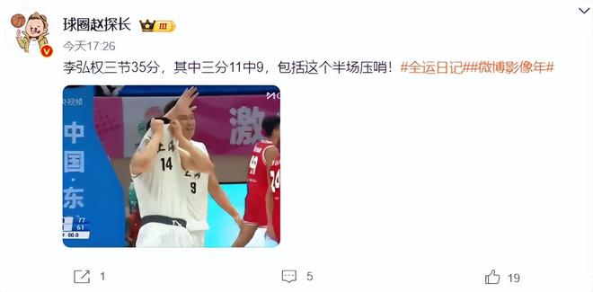 全场比赛李弘权17中14,三分12中10,拿到40分11篮板1盖帽1抢断1助攻,命中率82.3%,三分命中率83.3%,李弘权的个人表现实在是太过于炸裂。