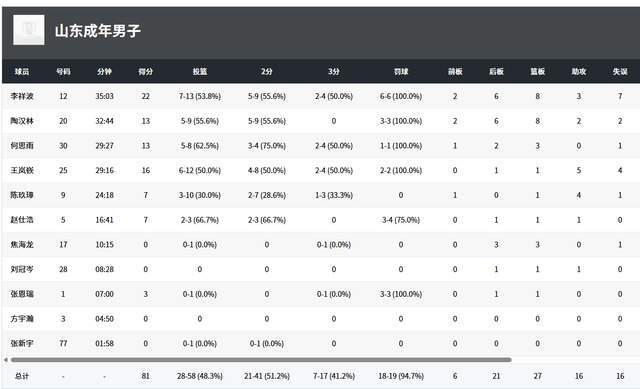 从数据来看,山东队4人得分上双,李祥波13投7中,拿到22分8篮板3助攻7失误,陶汉林9投5中,拿到13分8篮板2助攻,何思雨13分3篮板,王岚钦12投6中,拿到16分5助攻4失误。