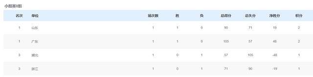 该组另一场比赛由山东对阵浙江,凭借老将安静独砍31分9篮板,王英竹19分11篮板,山东队以90-71大胜浙江队19分。山东队1胜0负净胜分+19,紧随广东,位列第2位。浙江排在第3,湖北第4位。