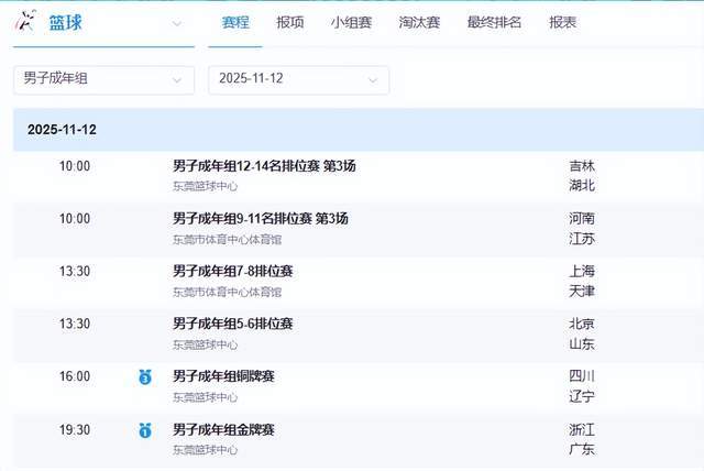 北京时间11月12日,十五运篮球项目又是被安排的满满当当的一天,在这一天,一共要打23场比赛,其中,男篮成年组将迎来收官之日,12支打进决赛的球队,都将在这一天亮相,决出最终的名次。其中,备受瞩目的自然是铜牌争夺战辽宁对阵四川,以及金牌争夺战浙江对阵广东。尤其是决赛,两支在小组赛有过交手的球队再次遭遇,看丁伟如何复仇杜锋,一黑到底吧。从现在的信息来看,央视安排了直播其中2场。