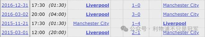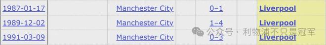 --利物浦上赛季客场对曼城2-0取胜,但自1987年到1991年的客场3连胜至今,还不曾连续2个赛季联赛客场击败曼城。